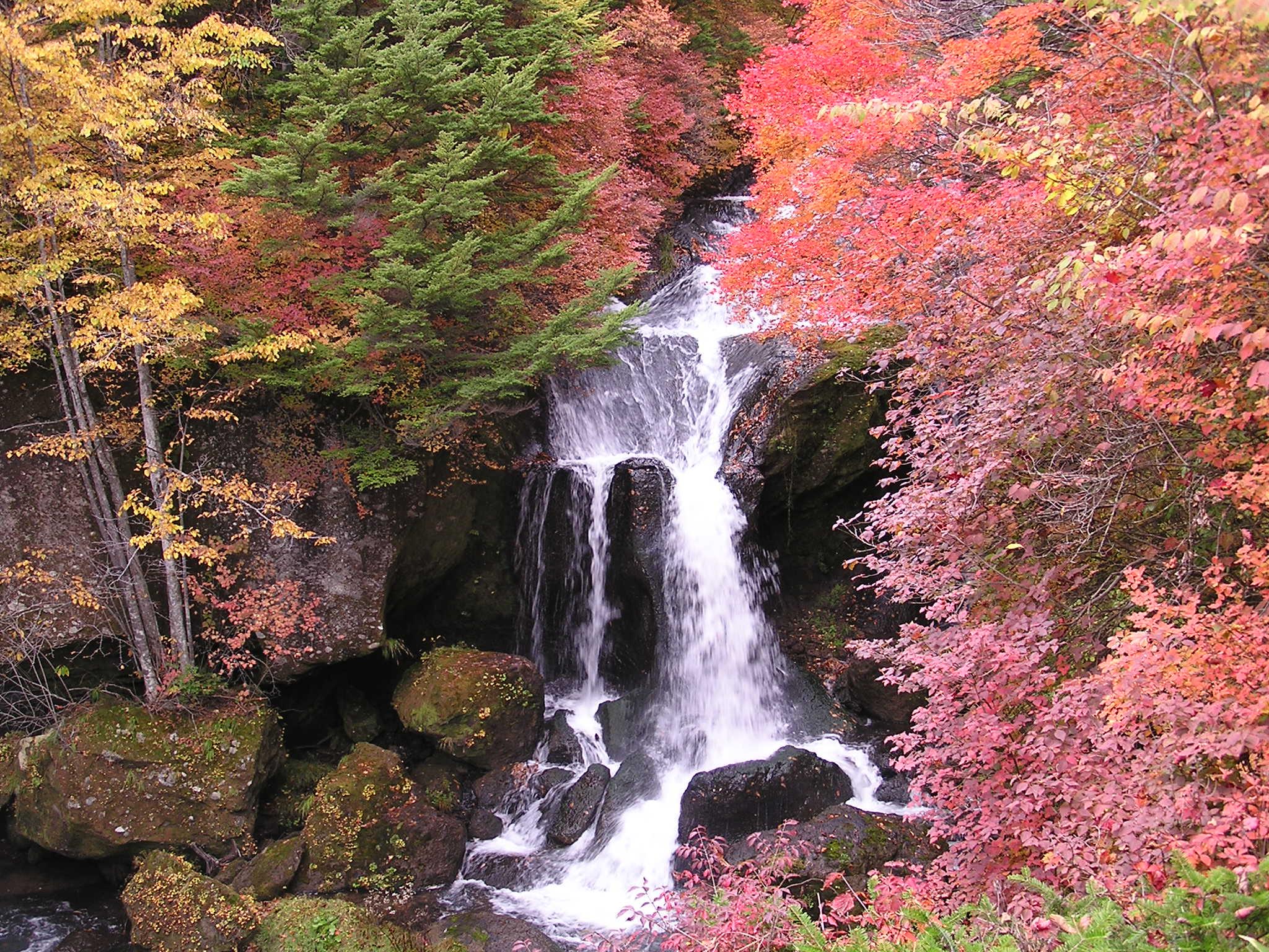 紅葉の季節の竜頭の滝はいろんな色合いが見事に調和し、