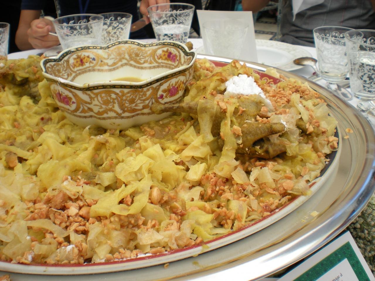 コース 3:これは雄鶏だと思う。とても肉が少なくかつ固くて、でも中国人は雄鶏は健康食だということを聞いた事あるので、がんばって食べました。もうこのへんで、おなかいっぱい。まんなかのクスクスなんてぜんぜんてがつけられない。私はモロッコ風のクスクス好きじゃないので。この後デザート、フルーツと続いておしまい。