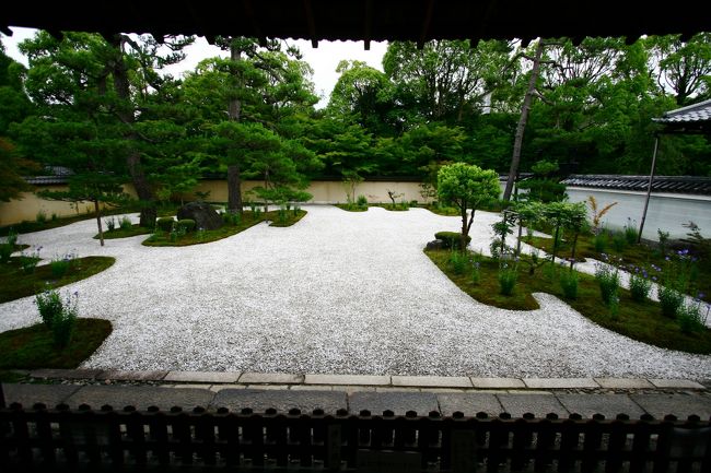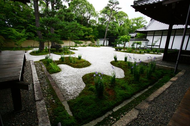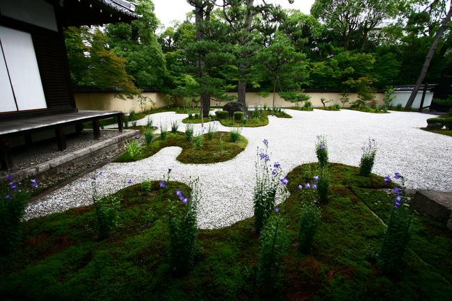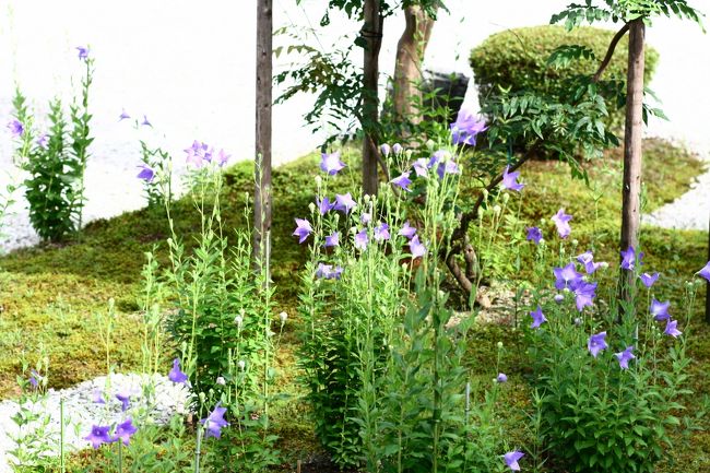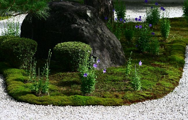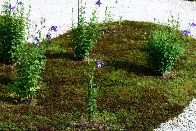 「源氏の庭」と名づけられている、咲き誇る桔梗の御庭は、白砂と苔で描いた美しい曲線で雲を表し、紫式部はここでの風景を見ながら源氏物語を執筆したのかと、思いつつ御庭を拝見。