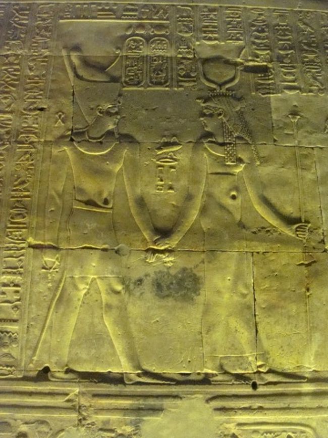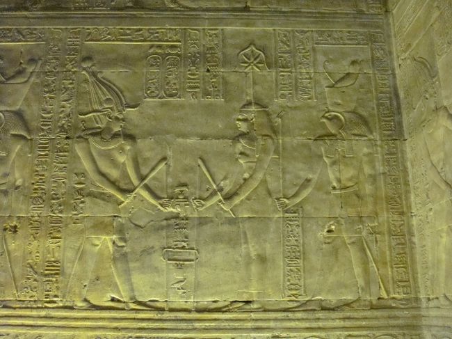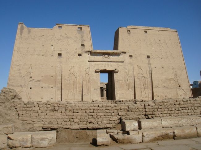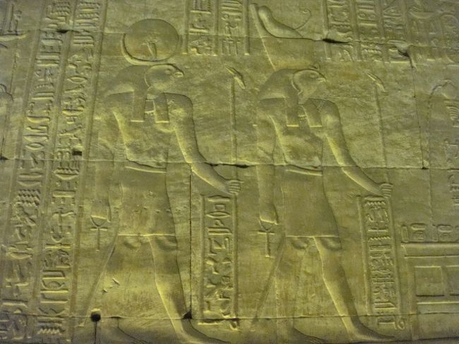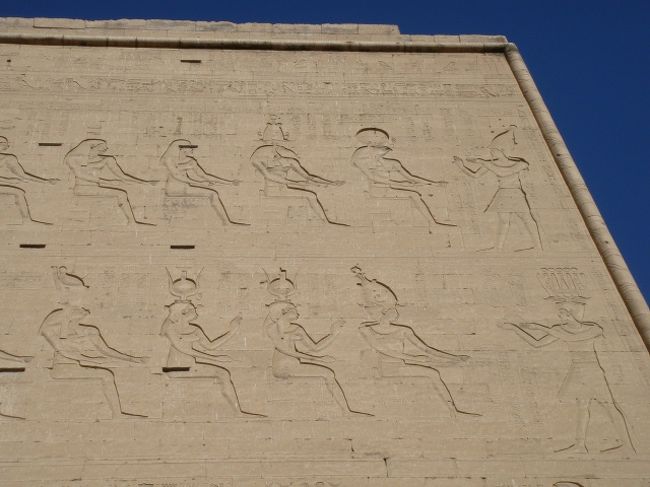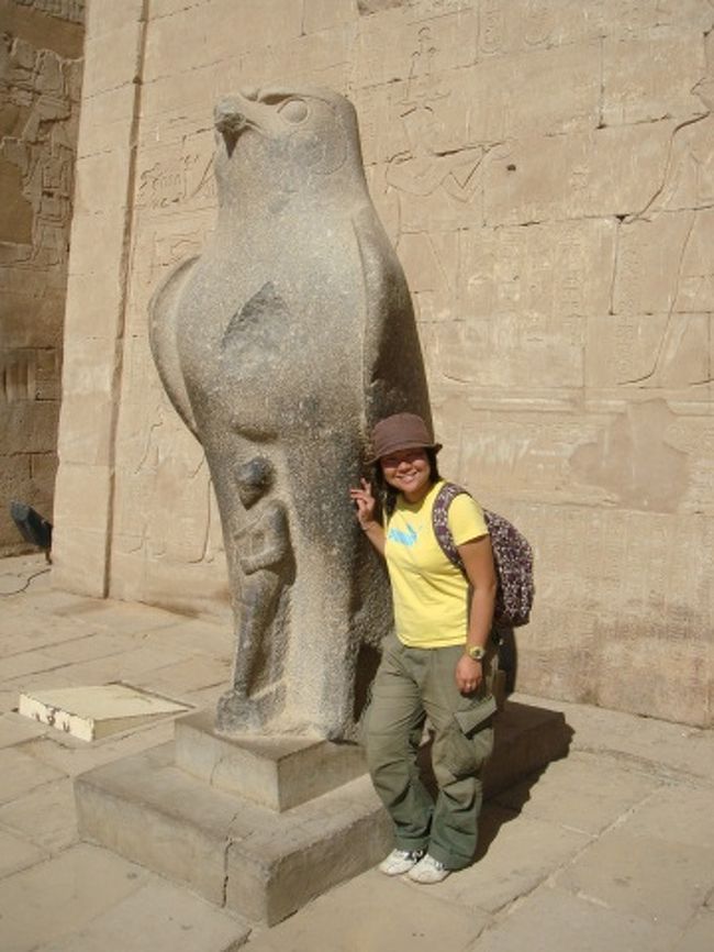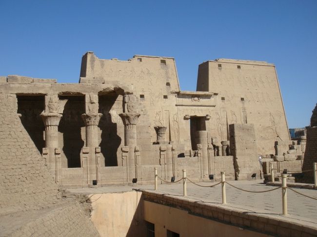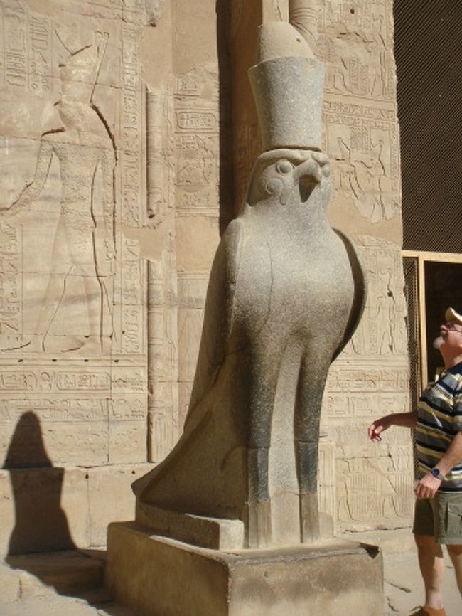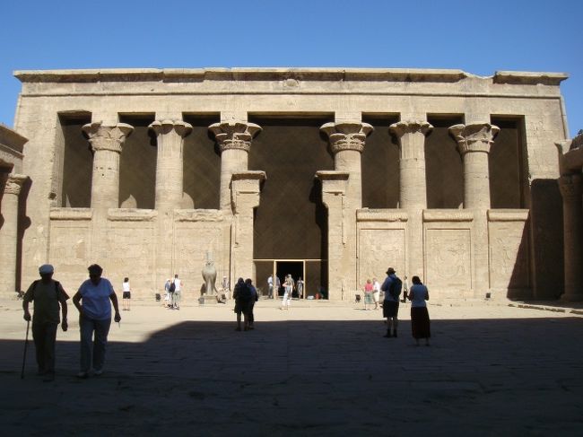 「コム・オンボ神殿」の後に向かったのは、エドフにある「ホルス神殿」。ここは、その名の通りホルス神を祀った神殿で、ホルス神のデカイSTATUEやレリーフが致る所で見られた。中でも誕生殿の母ハトホル神が赤ちゃんホルス神におっぱいをあげているレリーフは、興味深いなぁと思った。