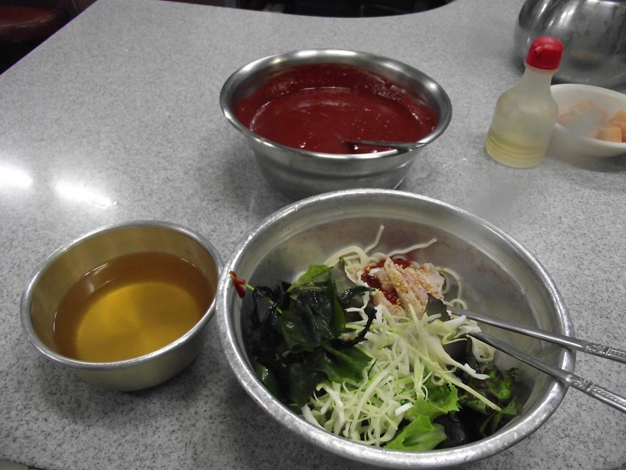 こちらが名物のフェグクス(4500ウォン、350円)。エイのお刺身が入っています。左側のスープが何と形容したら良いのかわからない、ダシの利いているいいお味です。自分でヤカンで注ぎます。
