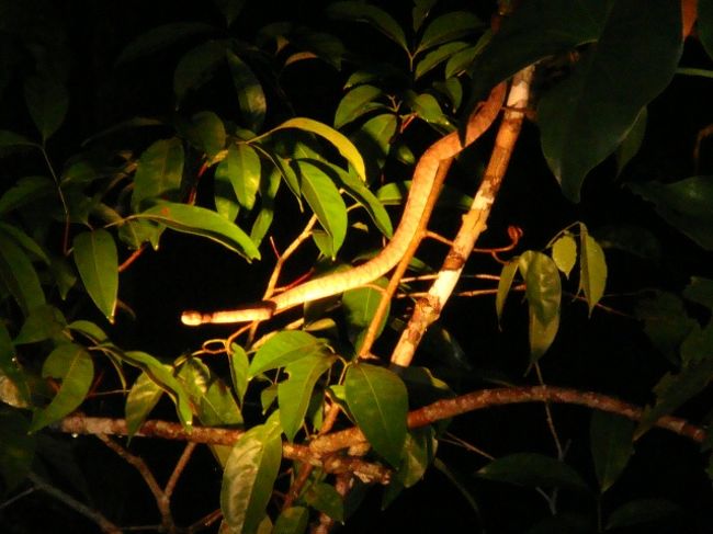 しばらくして暗くなったアマゾン河をボートで移動した。ライトで照らしながらの夜のジャングルは、昼間のアマゾンとは違った雰囲気を醸し出していた。木に止まった沢山の鳥達が泣き叫ぶのを見たり、ワニ達が赤い目を光らせてこっちの様子を伺っていたり、蛇が木々の致る所に巻き付いていてやっぱりアマゾンは自然の宝庫だと感じた。
