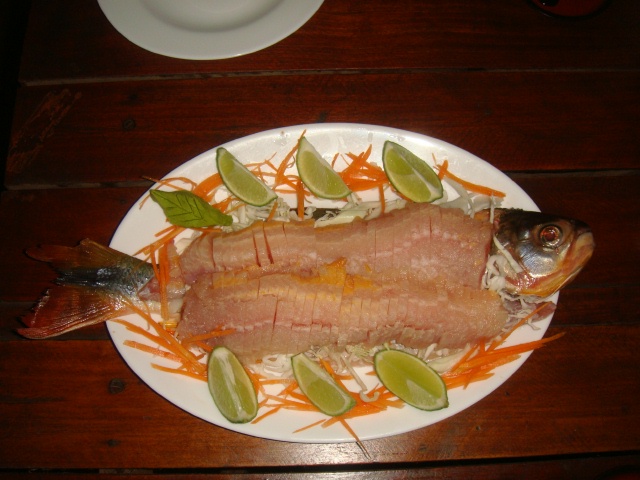 フェリッペ達にディナーを食べに行こうと誘われたけど、ボニート最後の夜どうしても食べたい物があったなみお。ってなワケでハヅキちゃんと一緒に日本人が調理場を担当するレストランに向かった。注文したのは今日一緒に泳いだピラプタンガの刺身&アサイジュース。ピラプタンガ自体初めてだし、日本を出て以来初めての刺身。アッサリした味だったけどワサビ醤油で食べるピラプタンガは本当に美味しく、久々の刺身に大満足で店を出た。