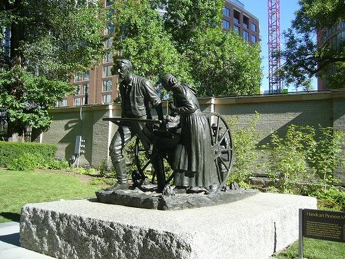 テンプルスクエア中庭の彫像。1847年に東部からやってきたモルモン開拓者がグレートソルト湖(Great Salt Lake)の南東に拠点を置いたのがソルトレイクシティ。