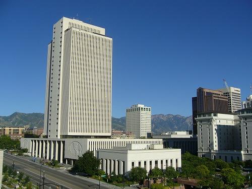 ソルトレイクシティの高層ビルのひとつ。これがモルモン教の本部ビル(総本山)。