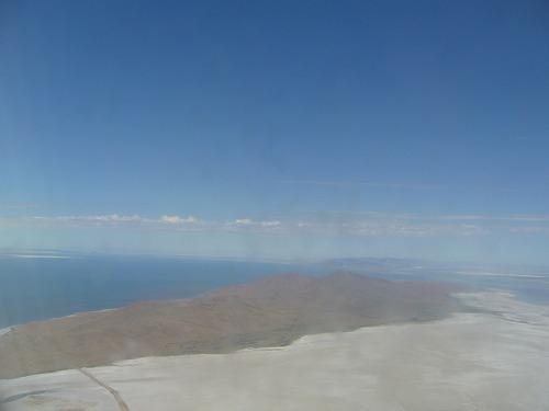 飛行機の窓から見えるのはグレートソルト湖(Great Salt Lake)。名前どおりの塩湖。白く見えるのは塩原。