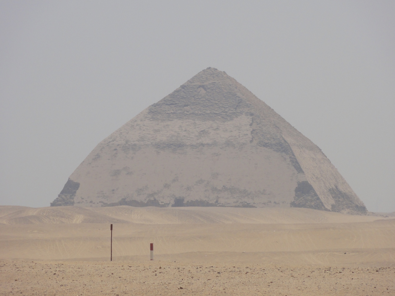 特徴的なのは屈折ピラミッドの名のとおり途中で傾斜角度が変わっていて、下部は54度27分、上部は43度22分となっている。