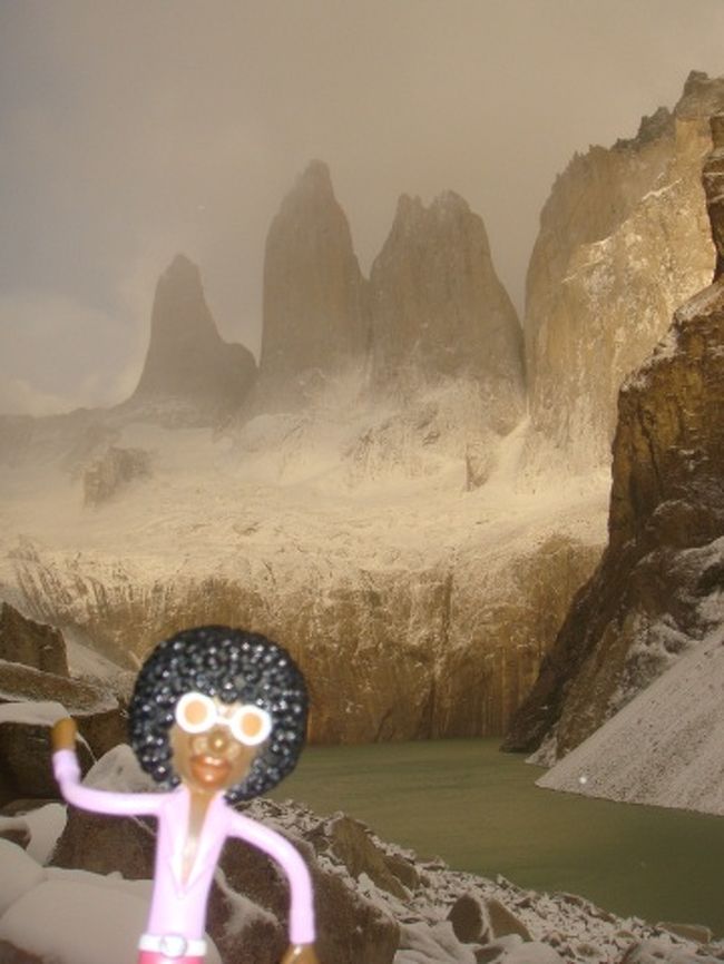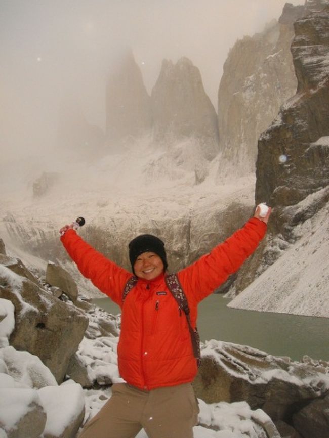 ツルツル滑る急な雪道を登りようやく「トーレス・デル・パイネ」に到着!! オーストラリア出身のケイトは、なんと雪を見るのが生まれて初めてと言う。初めて雪玉を作り、素直に感動しているのがキュートだった。