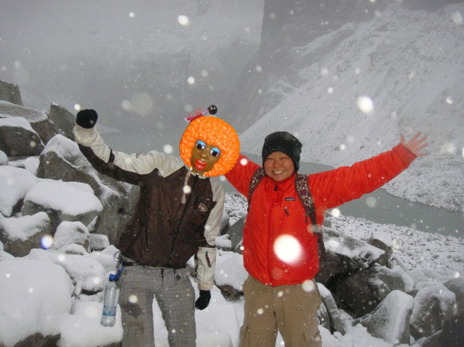 少し遅れてヘザーがゴミ袋のようなボロボロのカッパを着てやって来た。相変わらずテンションの高いヘザーの手にはコンロが・・・ここで暖かいコーヒーを飲もうと思ったらしい。手袋をバックパックに忘れたなみおの手は本当に氷のように冷たくなっていた。ヘザーにコーヒーをご馳走になり、少し温まることが出来た。