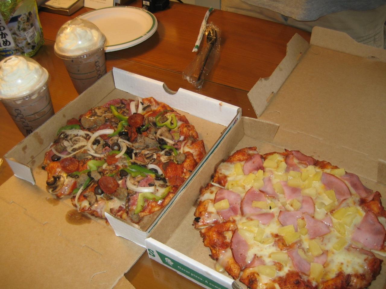 お昼過ぎにプールを上がり、ホテル内のピザ屋さんでテイクアウトして、スタバでカフェモカを買い、のんびり部屋で食べました。