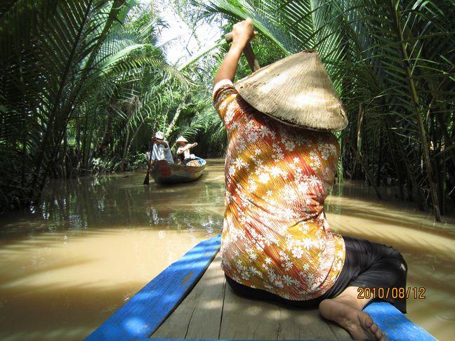 メコン川を渡り、小舟に乗り換える。漕ぎ手は殆どが女性か老人。仕事の順番を待つ女性たちが群がっている。船を降りるときにガイドにチップを1USDほどあげてほしいと言われる。 -