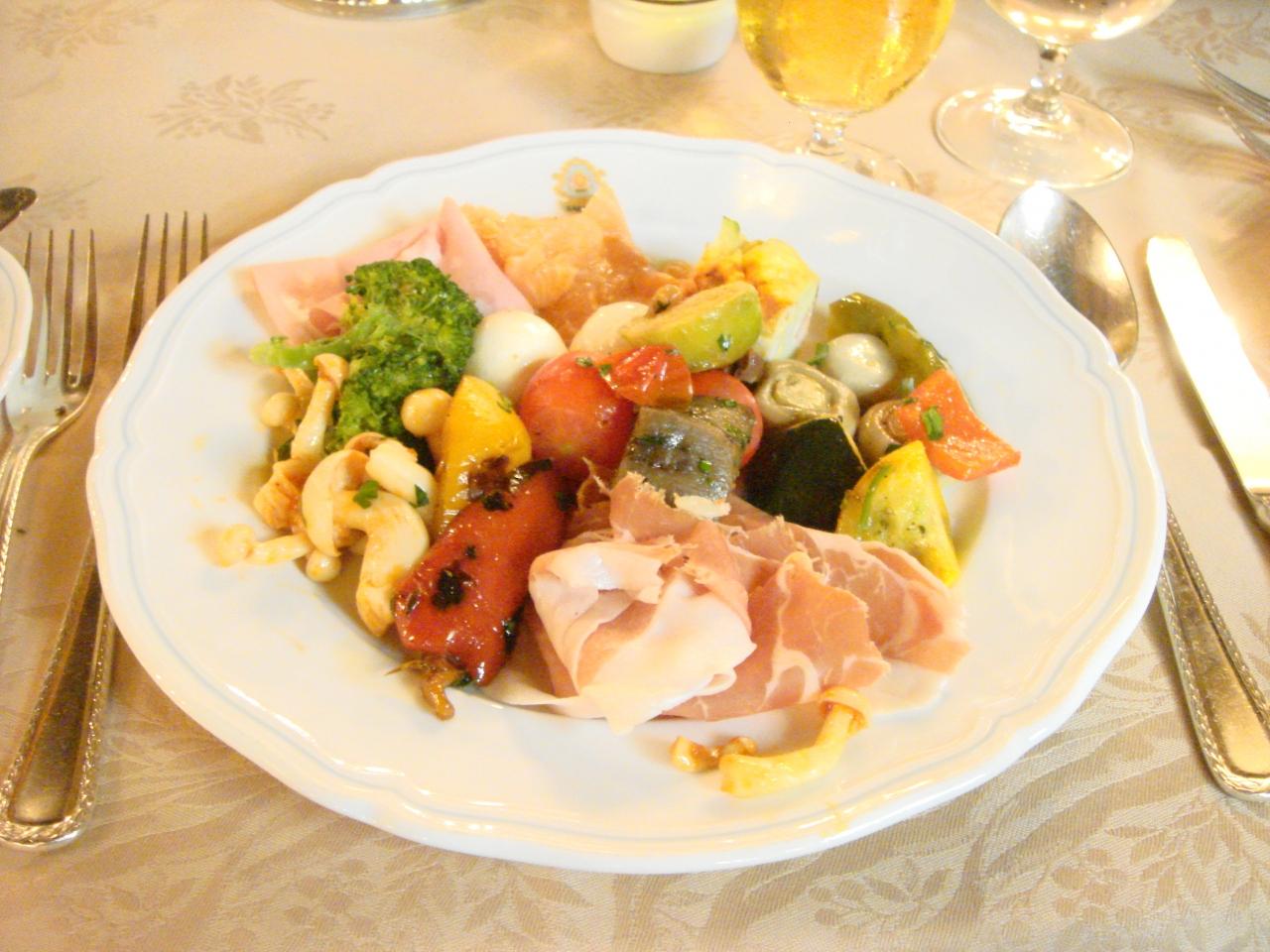 前菜は自分で好きなものを取りに行きました。ちょっと取りすぎました。パルマ産の生ハムが美味しかったです。