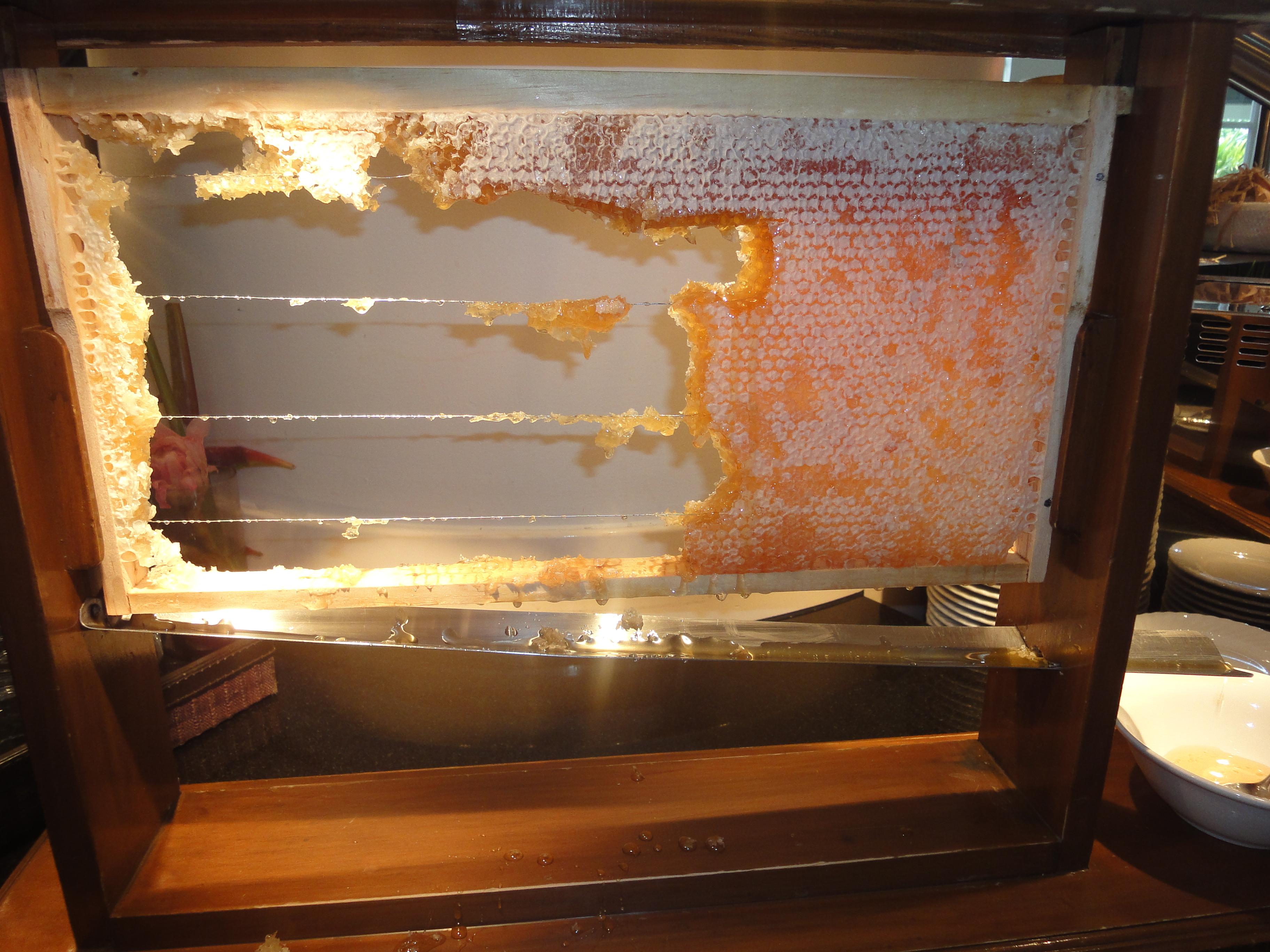右下に流れたはちみつをすくってワッフルやパンにかけるのですが、外人さんは大胆で、蜂の巣ごとごっそり持っていってました。 -