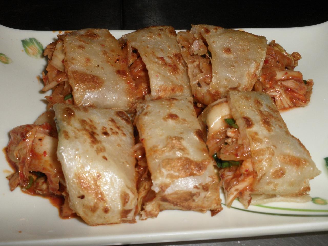 (キムチと豚肉などがクレープ状のものにまかれたもの) -