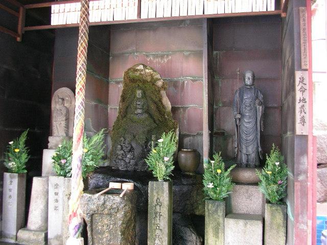 水掛不動尊は、たくさんのお参り客に水かけられて、苔むした姿が、印象的です。