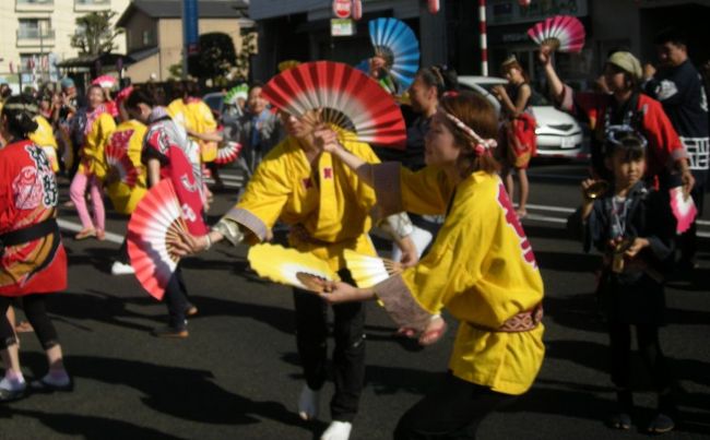 カラフルな扇子が、お囃子に合わせて不規則に動きあい、笑顔で舞う人たちをみていると、私もワクワクしてきます。
