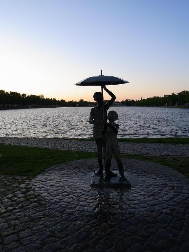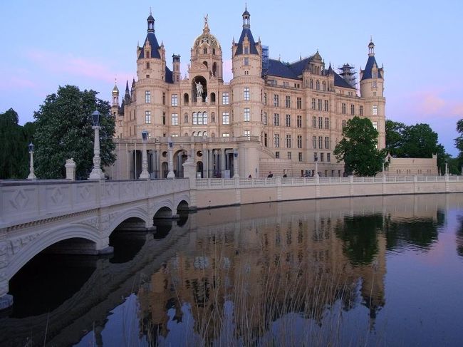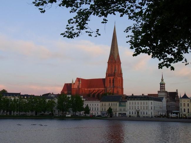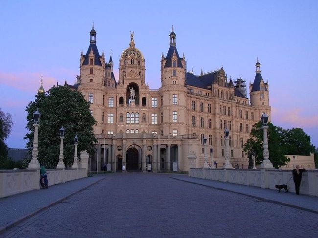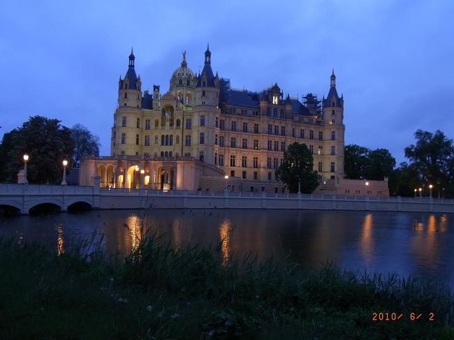 ヴィスマールから帰ってきた私とはくしょんちゃんをシュベリーンの美しい夕焼けとライトアップされた城が迎えてくれました