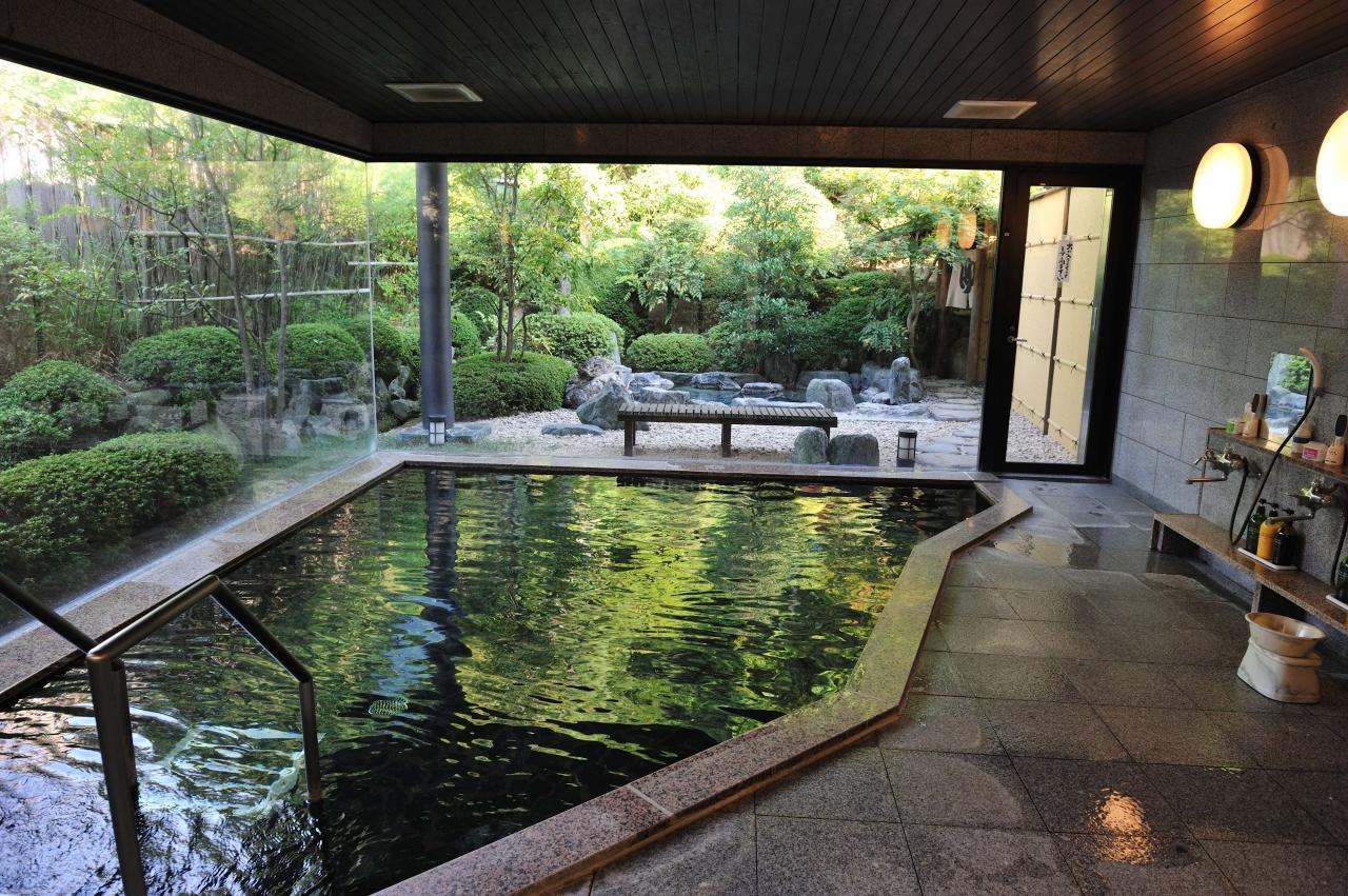 奥に露天風呂があり、奥右側の「ゆ」の暖簾をくぐって行くと洞窟風呂があります。 -