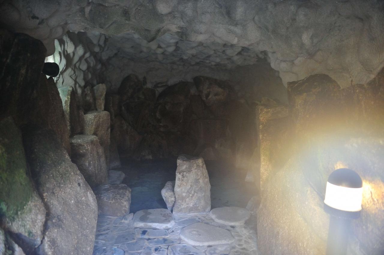 洞窟風呂、湯気でレンズが曇りました。