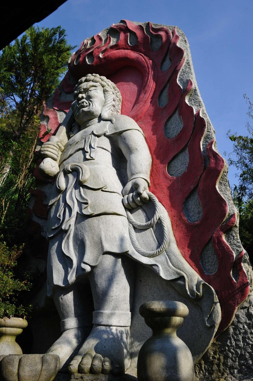 洞窟風呂入口には不動明王の石像が。