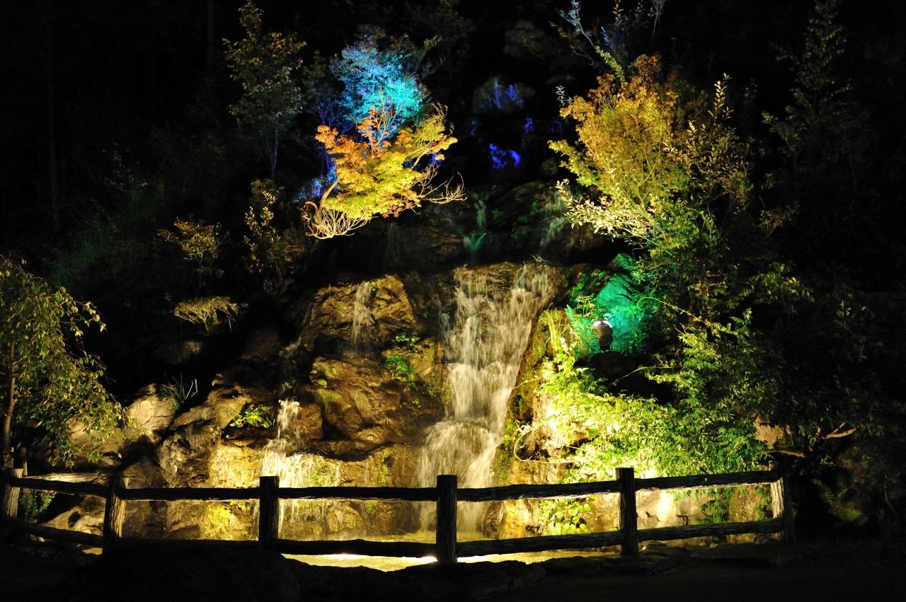 夜、駐車場脇にある小さな人口滝に照明があたり、きれいでした。