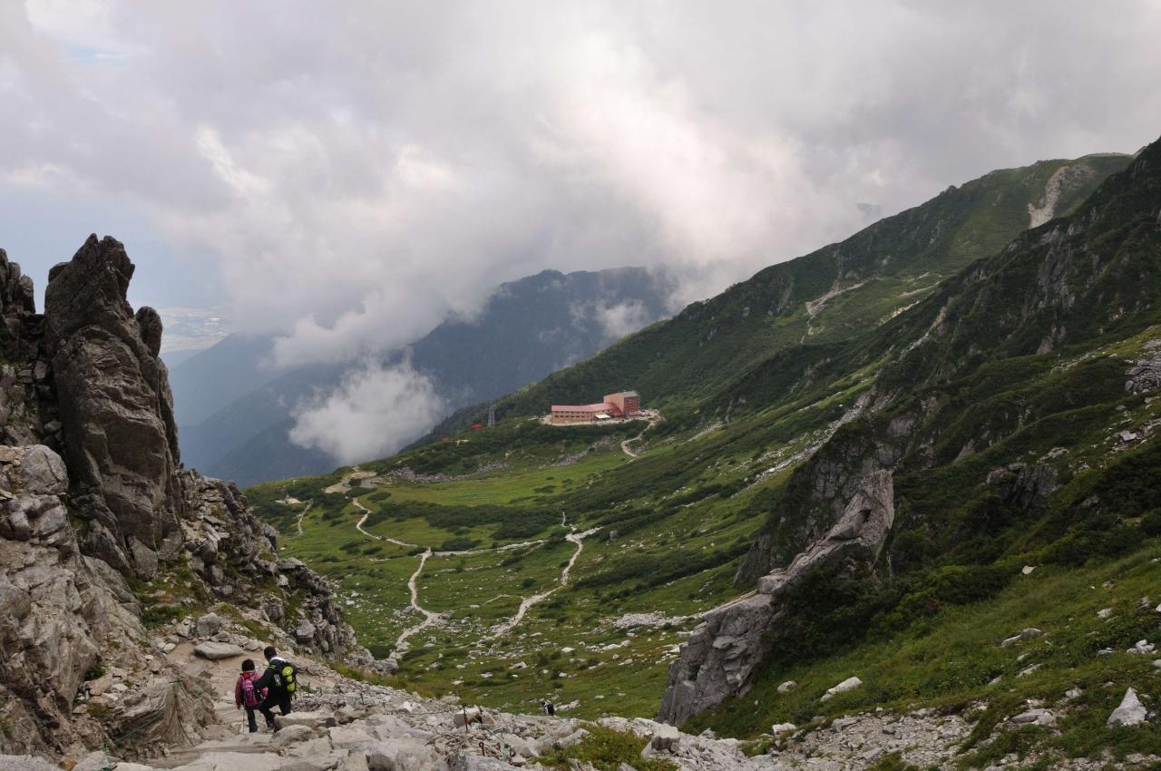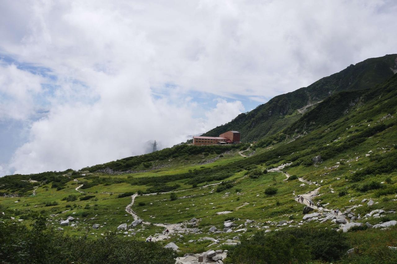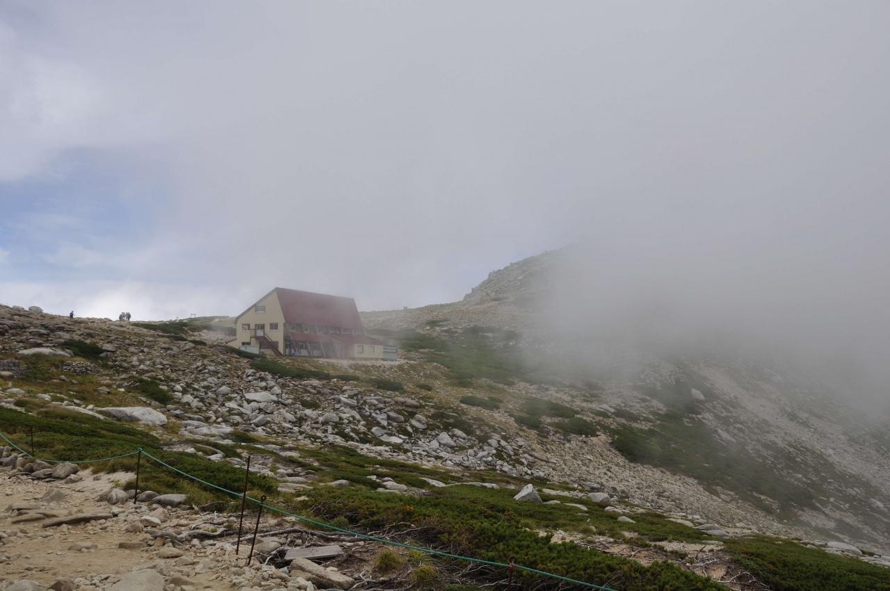 宝剣山荘から右方の中岳はガスがかかっています。