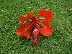 この樹はもうそろそろ花が終わりで、芝生の上に赤い花びらが散って