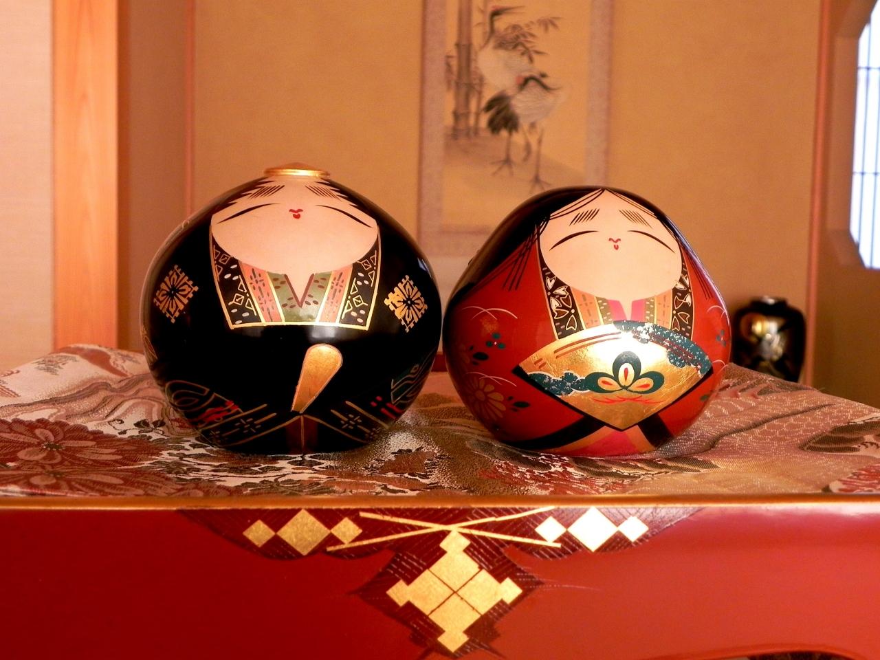 大内人形です。大内塗で作られており、台の菱形の金箔は大内家の家紋・大内菱をデザイン化したものです。