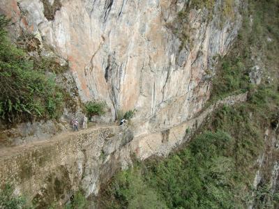 左側はそそり立つ巨大な壁、右側は谷底まで切れ落ちた断崖、その真ん中にインカ道(写真)が作られている。