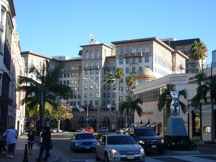正面にあるのが、映画『プリティウーマン』の舞台になったゴージャスホテルのビバリーウィルシャーです。荘厳な佇まいが印象的だ!