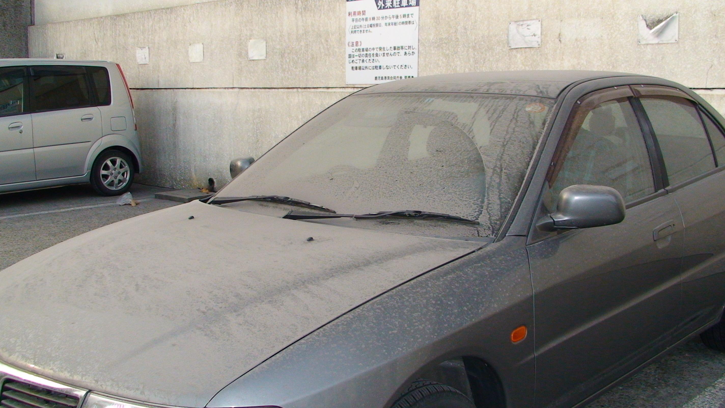 車のボンネット上に乗っている桜島の火山灰。