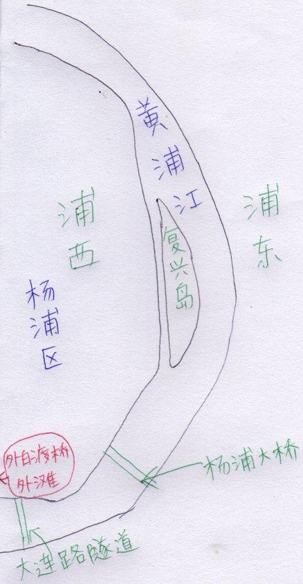 復興島は、こんな感じに浦東と浦西(楊浦区)の間にある島です。公園は島のちょうど中央あたりに位置しています。 -