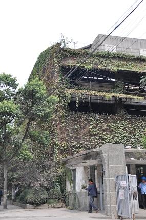 復興島公園の出口から出て、来た方向と逆方向に歩いていきました。すると、ツタに覆われた建物が。