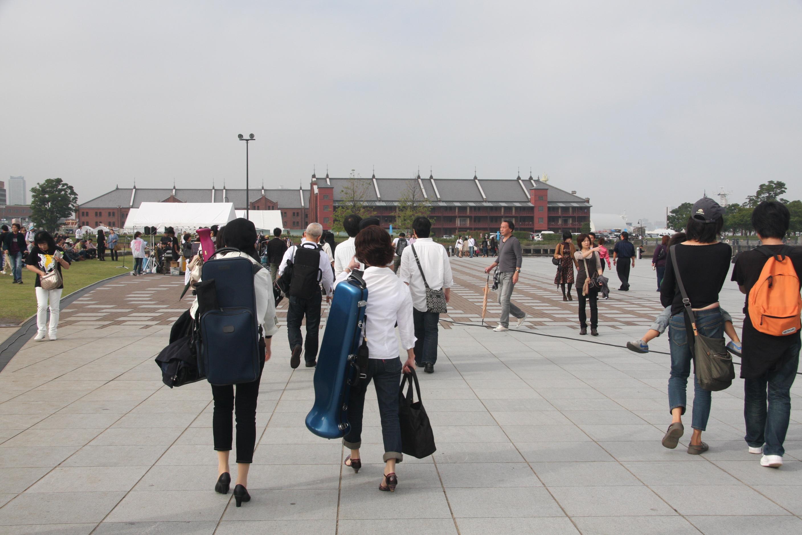 楽器を担いで会場へ向かう演奏者でしょうか。 -