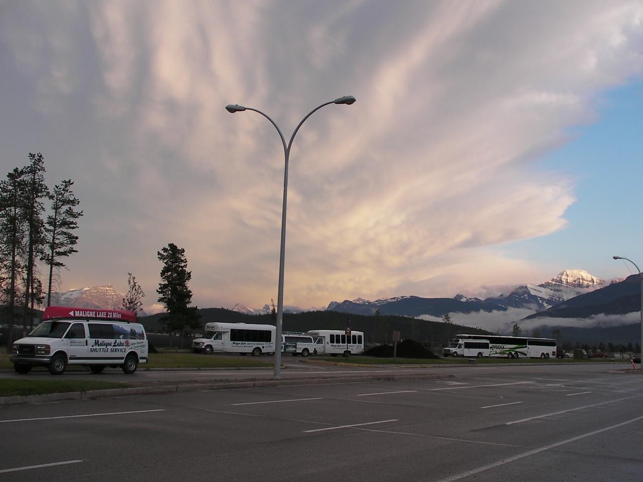 振り返ると夕焼けに染まるマウント・エディス・キャベルが見えました~スコールのような雨が降ってどんよりした空だったのに感激です。 -