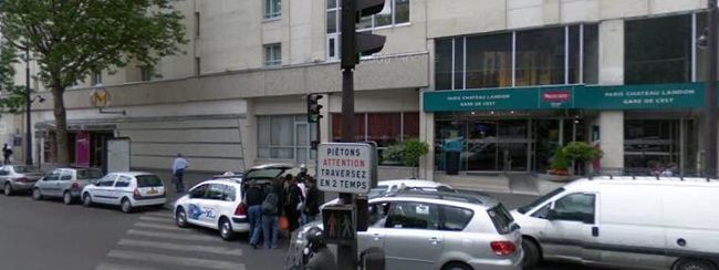 写真の右側がホテルの玄関、左側の黄色い丸の中のMがメトロ7号線「シャトー・ランドン」駅の入口この間の距離は直近の歩いて30歩でした。雨が降っても濡れません。