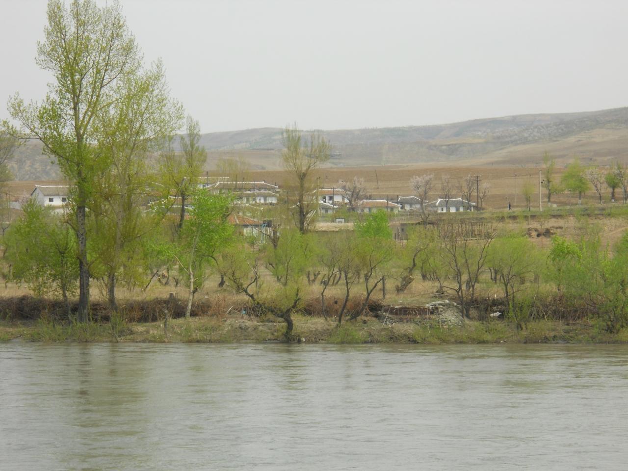 右側の青い屋根の建物は北朝鮮三峰里税関です。 -