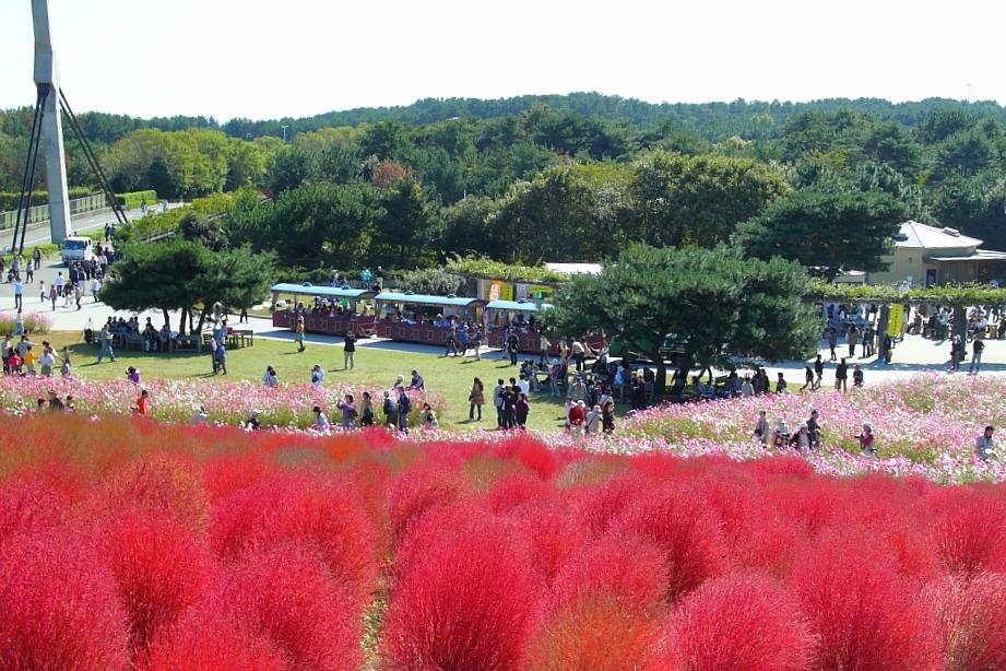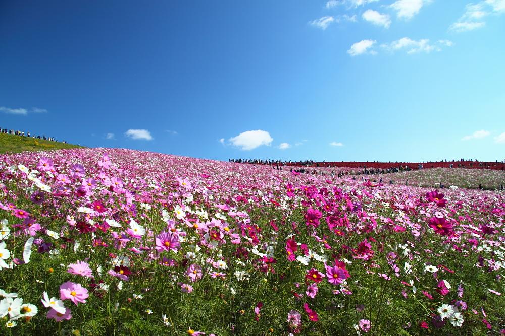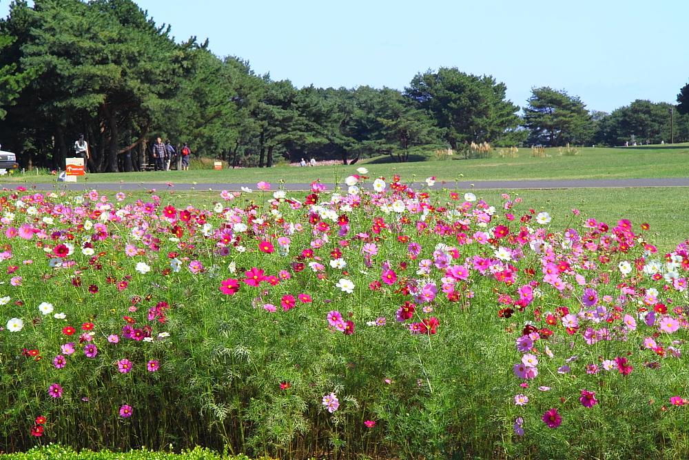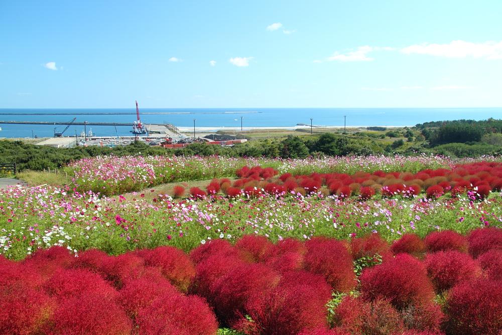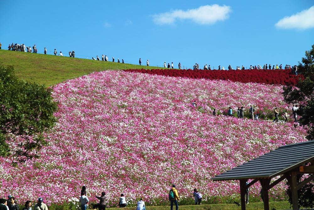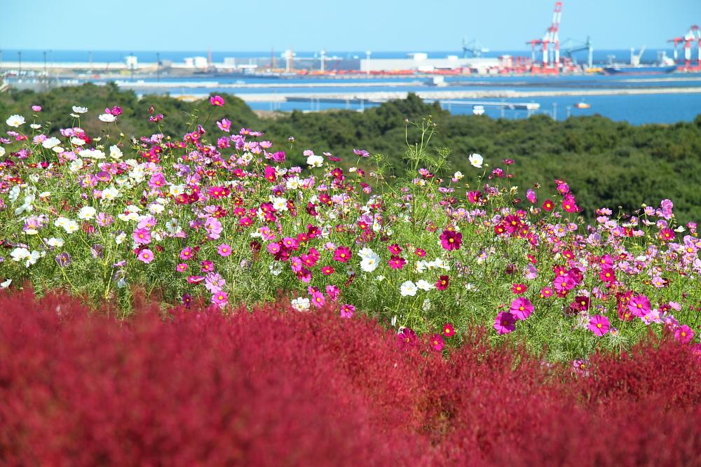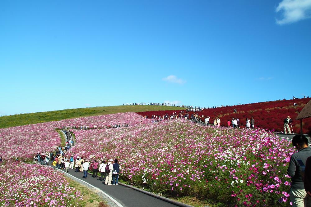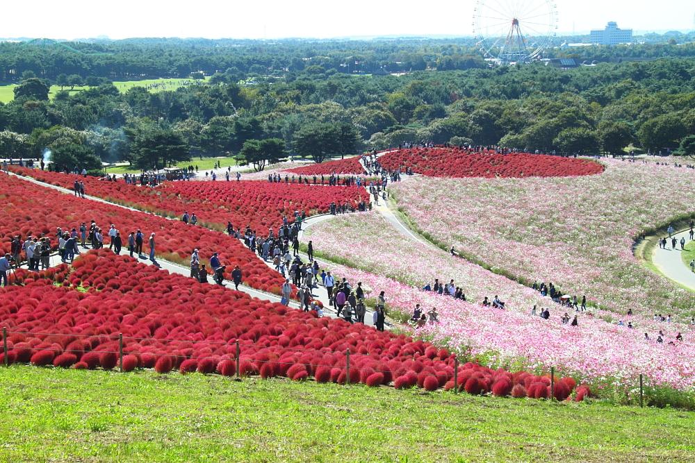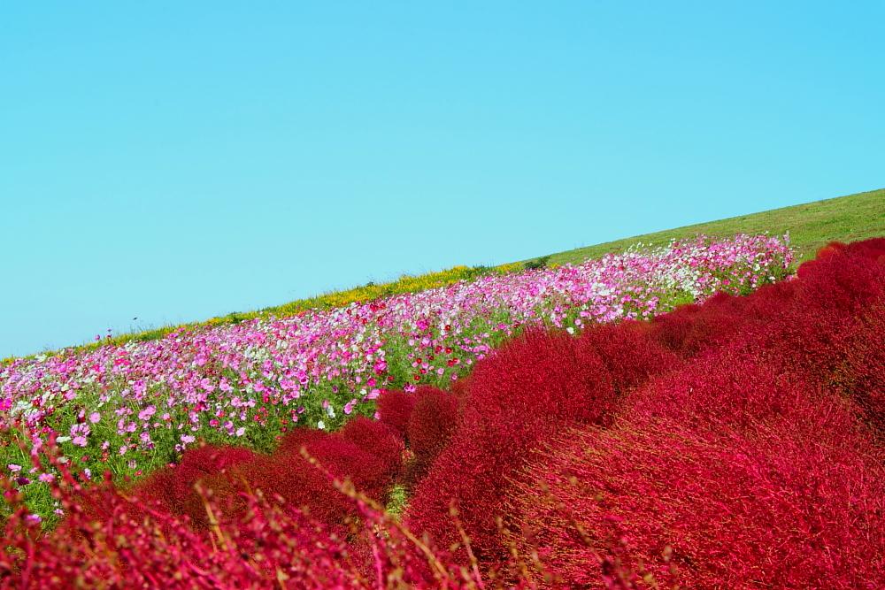 ひたち海浜公園のコスモスとコキアのコラボ、見事な色彩と広大な広さ!
