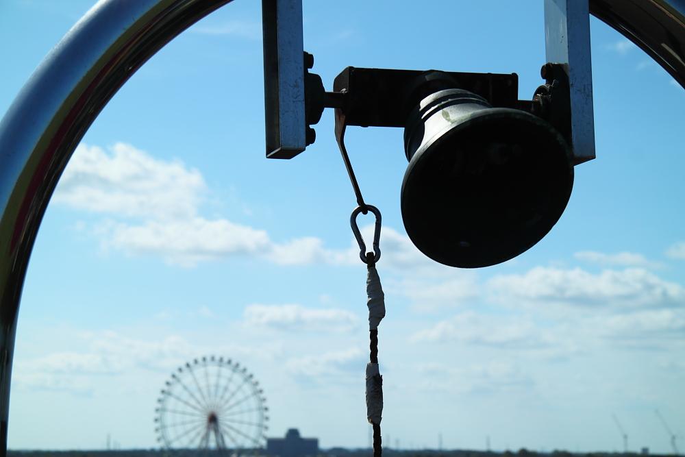 丘の上にある鐘。遠くには公園内にある観覧車。