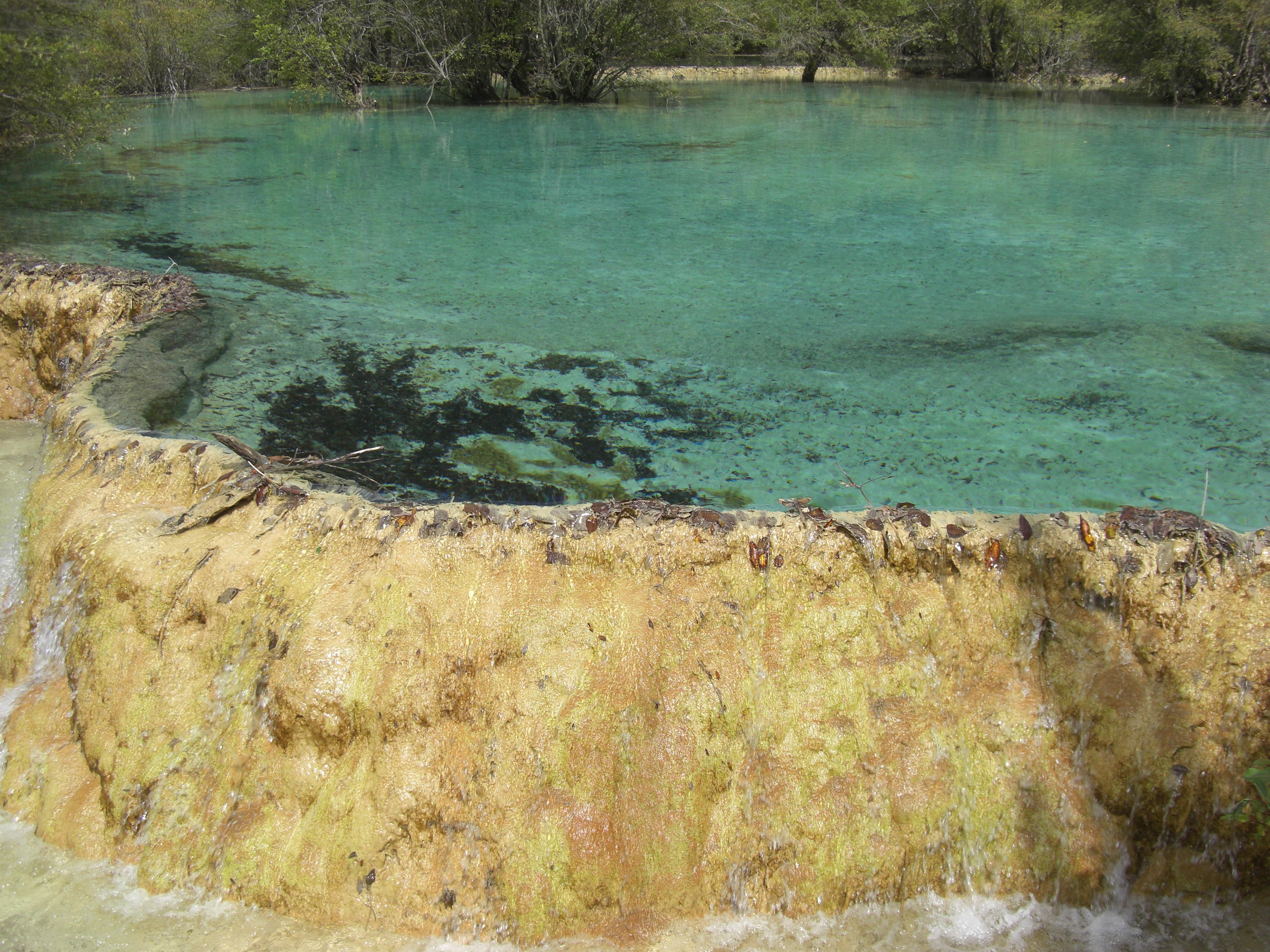 牟尼溝に到着すると観光客はほとんどいなかった。切符を買って英語のガイドブックをもらって中に入ると山間の草むらという感じだった。順路に従って少し歩いて行くと水のきれいな池に出た。九寨溝と同じような感じだ。ここの水もきれいである。 -