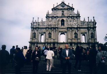 お参りを済ませて、市街地の狭い道路を上りながら聖ポ−ル天主堂跡へ向かう。ここは市街中央の丘の上に建つマカオの中で最も有名な観光地になのだが、残念ながら建物正面の壁面と階段壁の一部だけしか残っていない。十七世紀初めにイタリア人のイエズス会修道士がこれを設計、工事が難行していたところに、日本を追放された日本人キリシタンが協力して完成し、当時は東洋で一番美しい教会といわれていたそうだ。それが一八三五年の台風時の火災で焼け落ち、今ではその残骸としての壁面しか残っていない。だが、正面の階段に立ってじっと眺めていると、往時の壮麗な教会の姿が浮かんできそうだ。