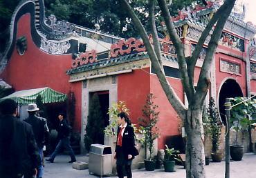 バスはまず海岸のほとりに建っている小さな媽閣廟に止まる。これはマカオ最古の道教寺院で、船乗りの守護神“阿媽”を祀っている。ここはその昔、ポルトガル人が上陸した時、地名を尋ねたら「阿媽閣(アマカオ)」と答えが返ってきたが、それがマカオと短縮されて呼ばれるようになったという地名発祥の地としても知られている。これはまた、昨日参った黄大仙廟と同類の寺院なのだが、それより規模は大分小さいものである。狭い寺院の中に入ると、大きな渦巻き状の線香が天井から何巻もぶら下げられて煙っている。これらは信者が灯すものだが、一度火がつけば二週間も燃え続けるという。