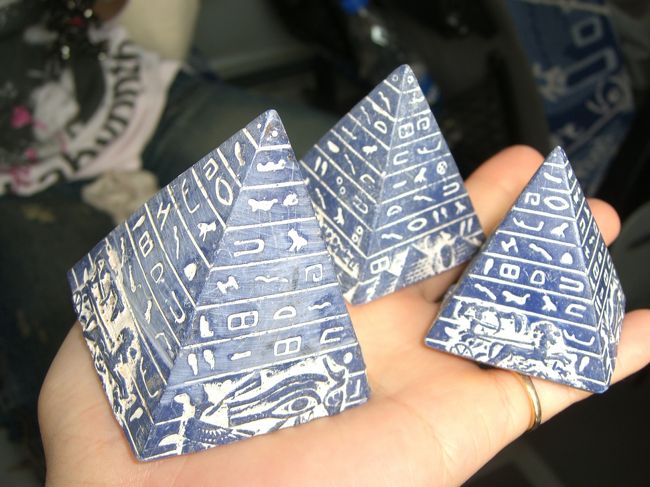 お土産物売りのおじさんに、クレオパトラ風ネックレスを付けてもらい、ピラミッドと遊びました♪