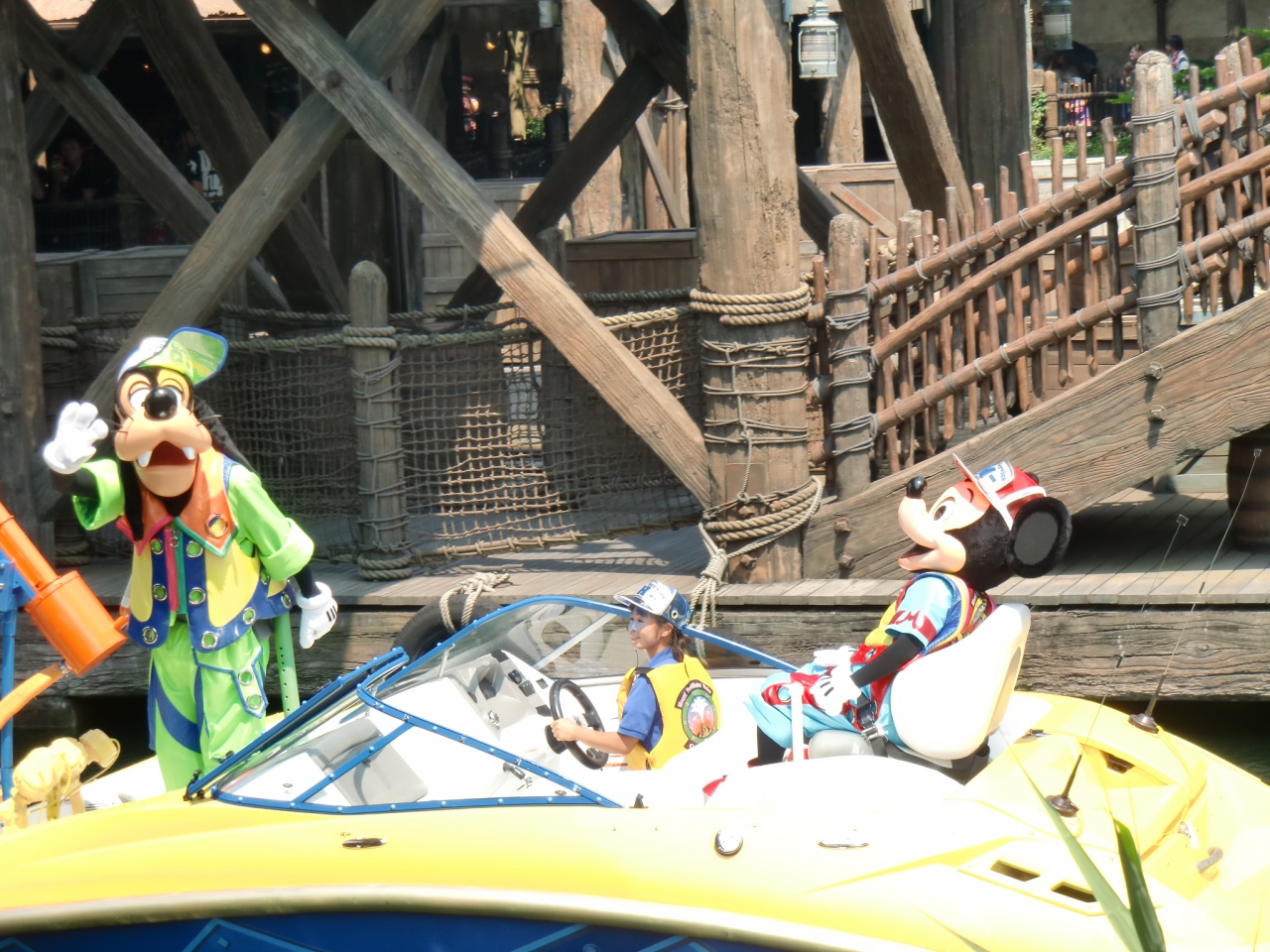 川辺に近づくと、水面ショーを終えたミッキーたちが、帰って行くところに出くわしました。