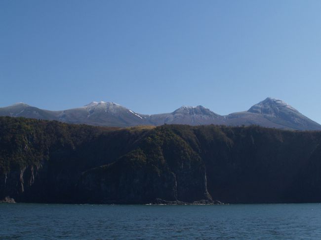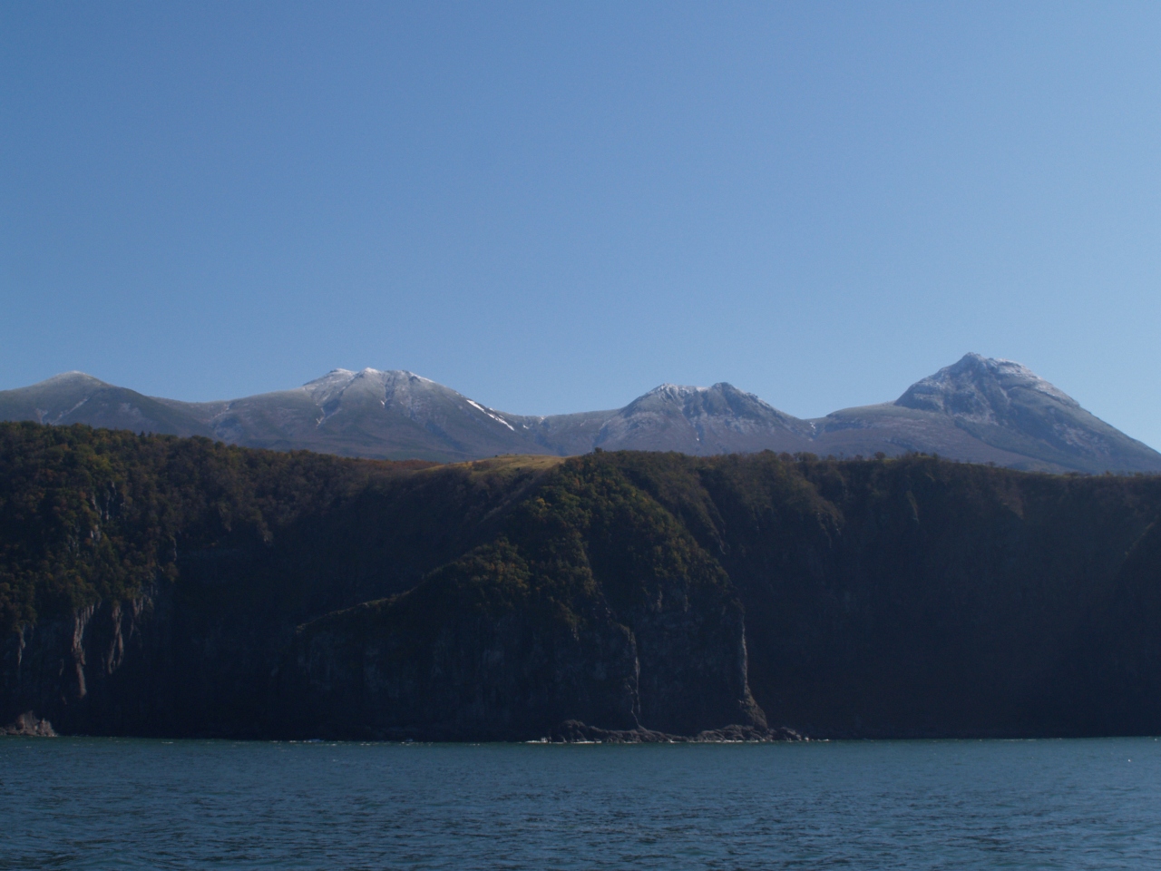 海岸からは切り立った崖の上に大地が広がり、その向こうに知床連山が聳えている。容易には踏み入れ難く、知床の自然が残った理由が分かる。まだ、10月中旬だというのに山の頂上あたりは雪を頂いて白くなっている。