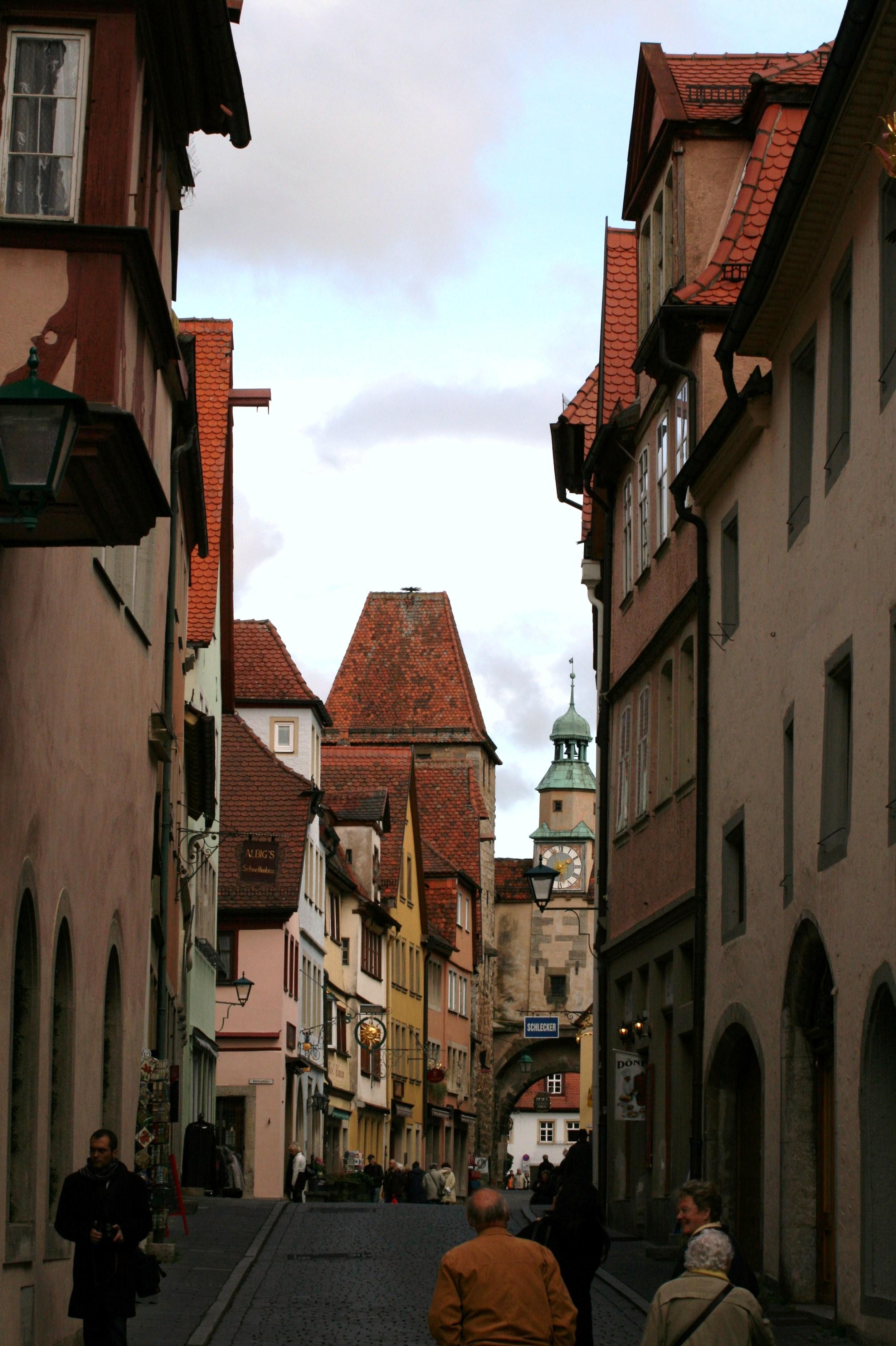 城壁内の通りの光景です。遠くに尖塔のような建物が見えます。ローテンブルクで一番古い市壁の名残とされるマルクス塔です。第二次大戦末期の1945年3月に、アメリカ軍による誤爆を受け、街の4割ほどが被害を受けたとされます。
