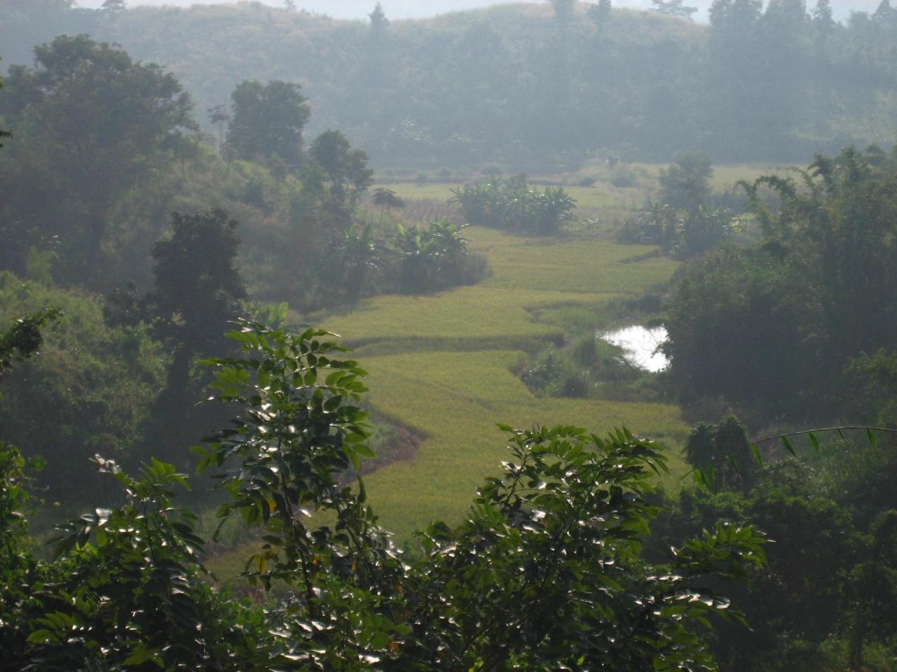そんなこんなを克服しての、今回のチェンライへの旅。いや〜、行けてよかった。都会暮らしが苦手な我輩、山とみどりに囲まれると、それだけで落ち着きます。タイともいえど、ここまで来ると、空気が清清しいったらないのです。さわやかです。朝は鳥の声で目覚め、朝焼けに照らされたもやにかすむ山々と懐に広がる田畑。。。。