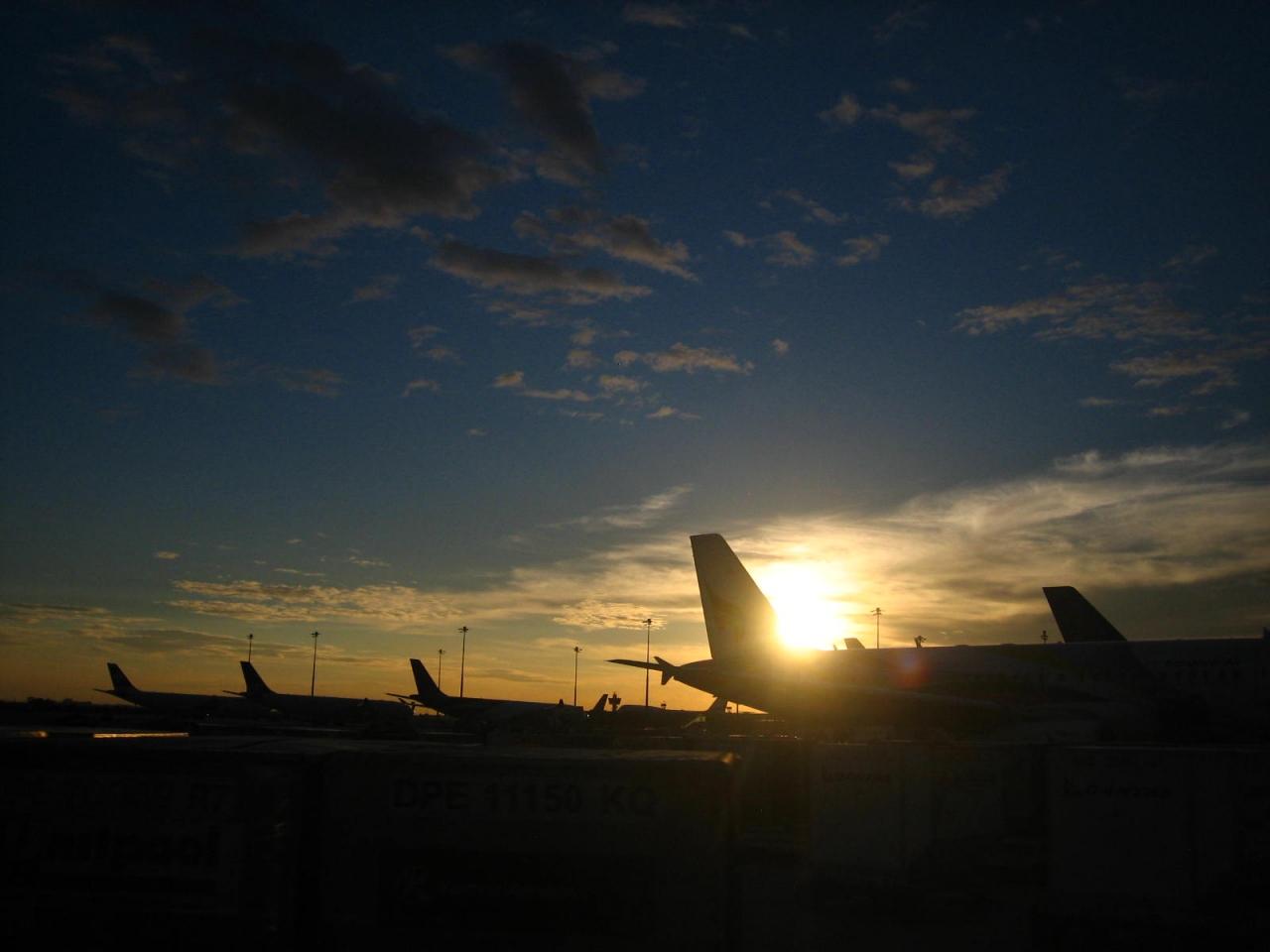 沖止めのため、バスで空港内を移動してターミナルへ。ちょうど夕暮れの時間。これはこれできれいなんだけどね、やっぱり自然の夕暮れがいいな。