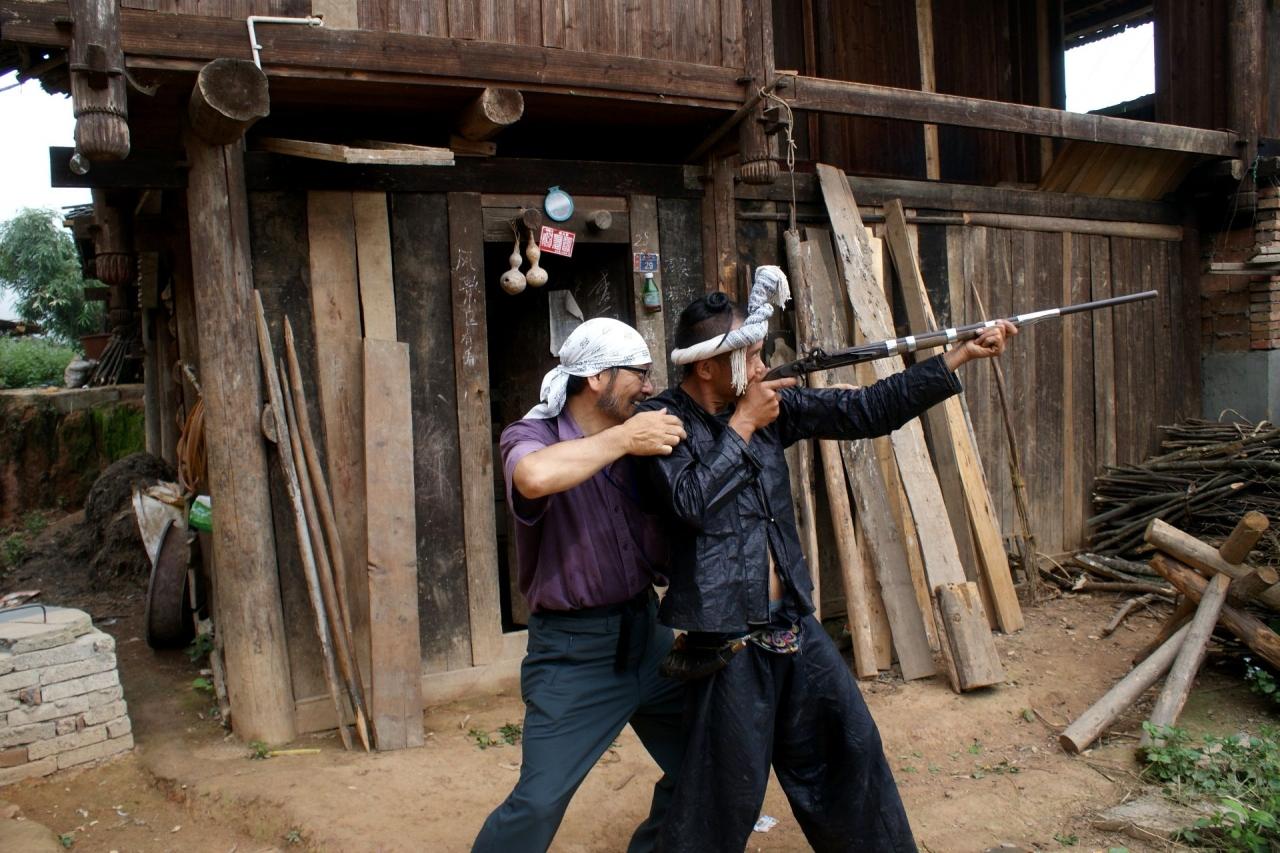 男子は腰に鉈を常備、頭は真ん中を辮髪状に伸ばし周りを剃っており、時には銃までも担いでいます。