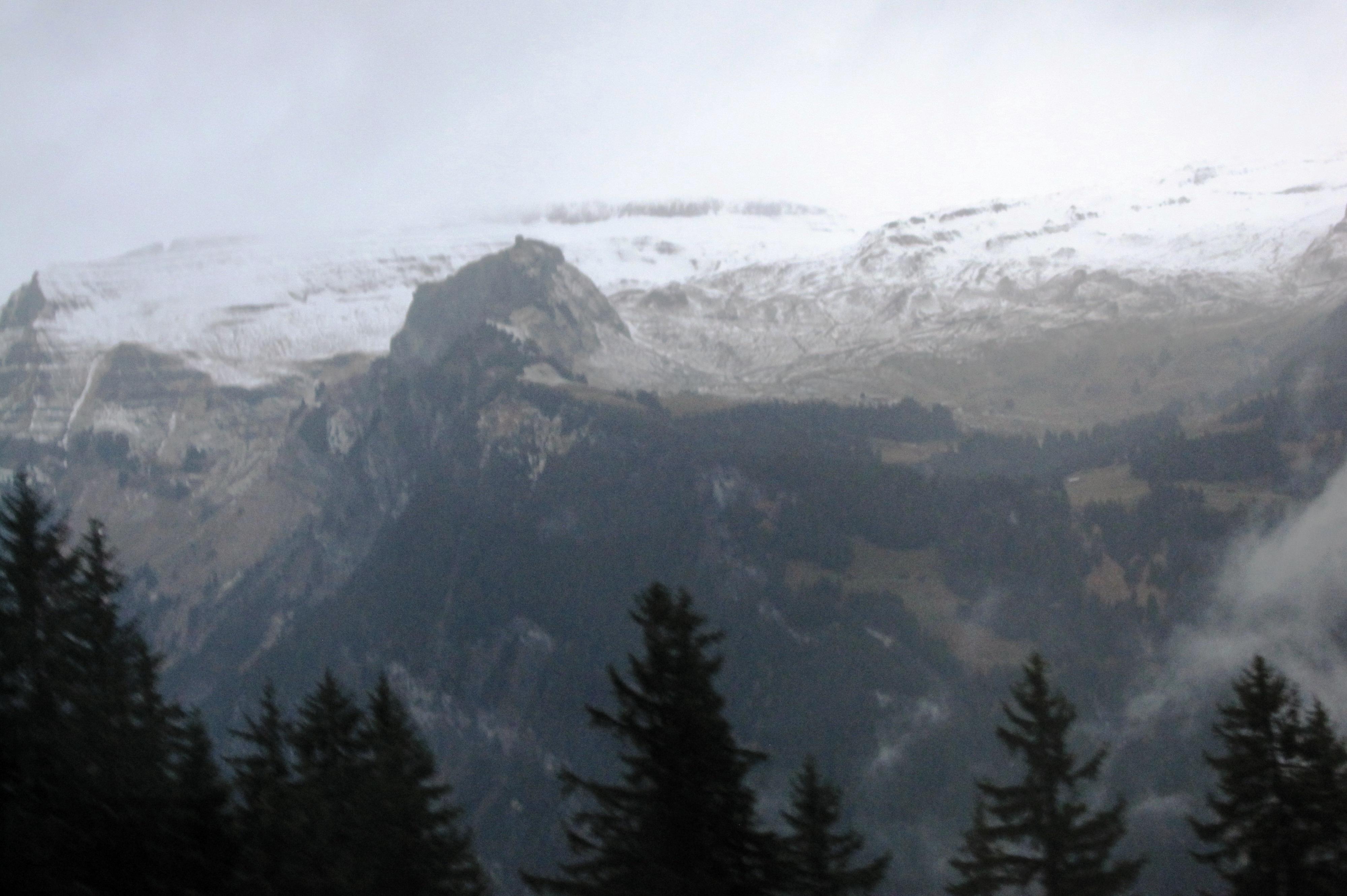 暫くは、広大なアルプス光景の中でも、比較的なだらかな光景を見ながらの列車での観光でした。霧か雨で霞んでしまい、全く視界が利かないことを覚悟していましたが、十分に山の景色を楽しむことが出来ました。